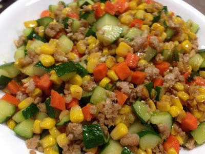 材料:小黃瓜切丁 紅蘿菠切 玉米粒 絞肉 蒜末. 蔥花 醬油