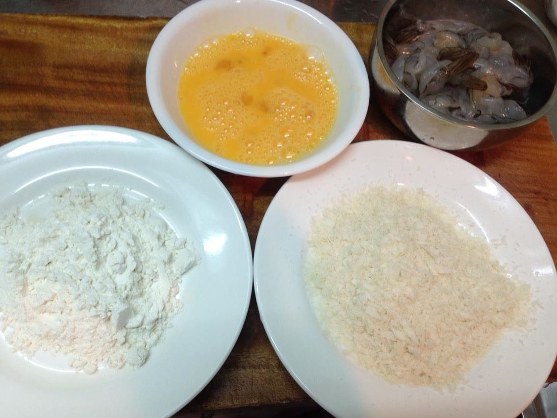 3. 將蝦沾1麵粉 2蛋汁 3麵包粉 油熱將蝦放入炸