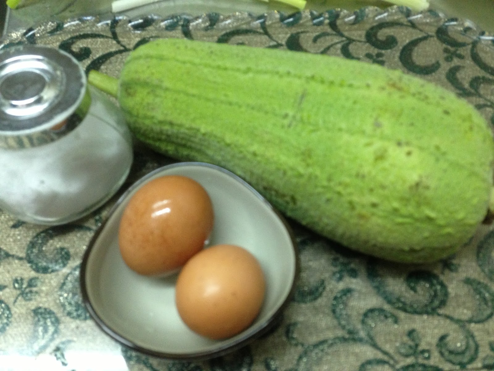 材料: 一個絲瓜 兩個雞蛋 鹽 橄藍油