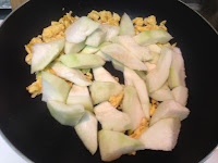 2. 一小匙橄藍油先炒蛋 將蛋炒花炒出蛋香味 加入絲瓜少許鹽