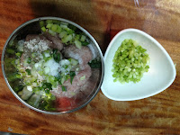 將絞肉加 米酒 鹽 蔥花 胡椒粉 蓮藕粉攪拌均勻