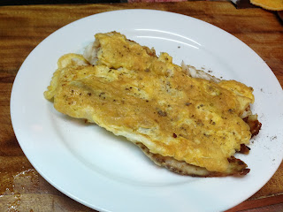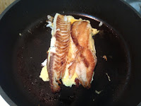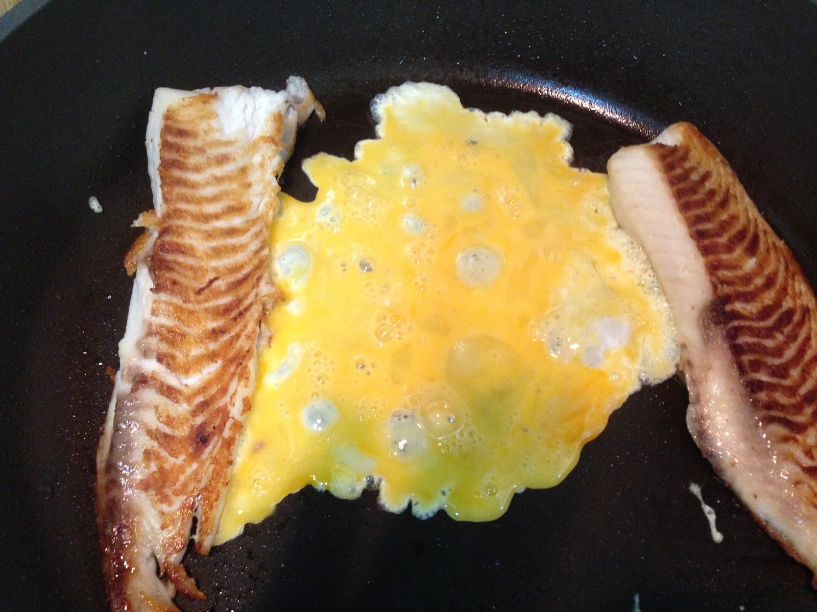 後把魚片擺入蛋上面 煎至蛋熟香關火盛盤