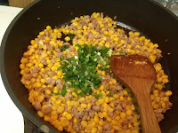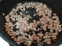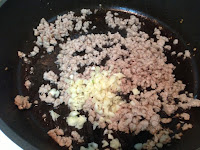 2. 乾鍋先將絞肉炒熟 加入蒜末炒出蒜香味後 放入玉米粒