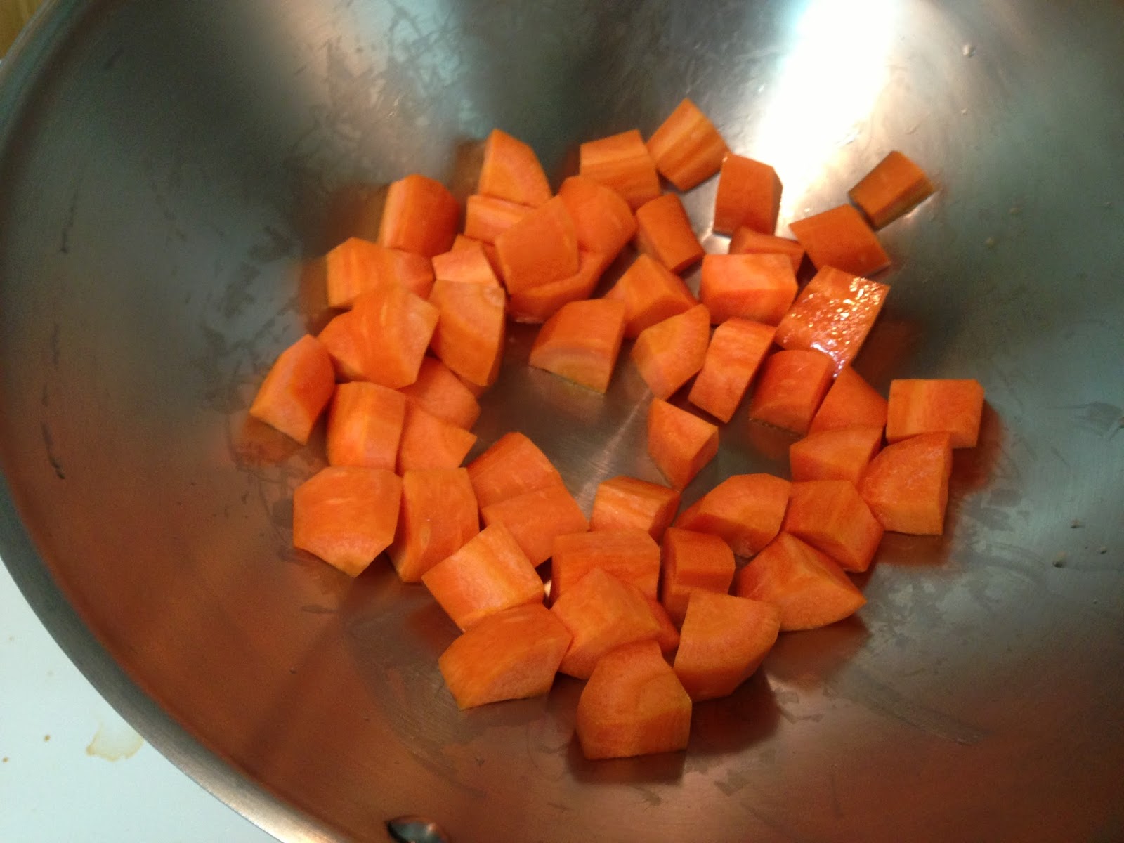 2. 一匙油先炒紅蘿菠 再加馬鈴薯 牛肉湯汁 咖哩粉 一碗水