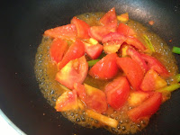 2. ㄧ小匙橄蘭油爆香蔥段放入蕃茄翻炒ㄧ下 加水將蕃茄煮