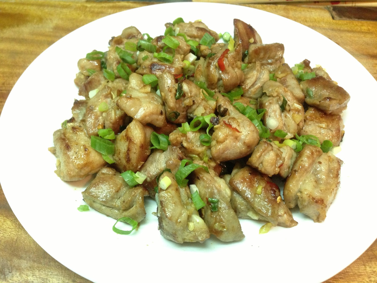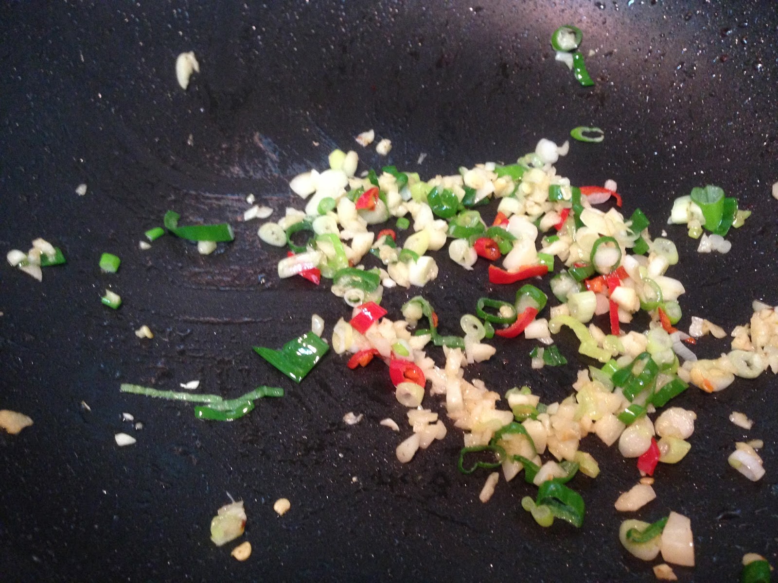 3. 蔥花 蒜末 辣椒 利用鍋中的油爆香後放入炒熟的排骨肉