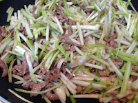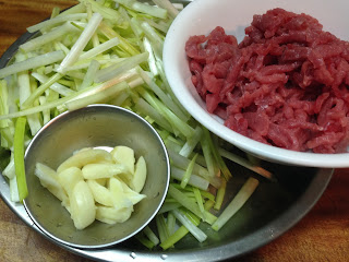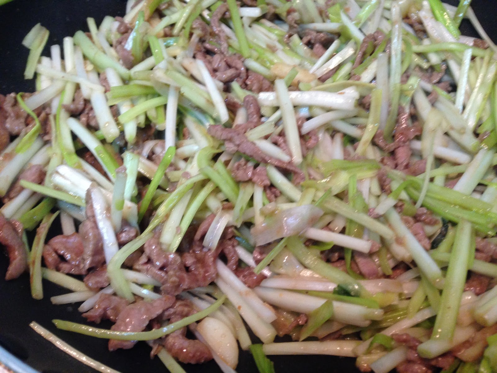 材料: 牛肉絲 韭菜黃切段 蒜頭