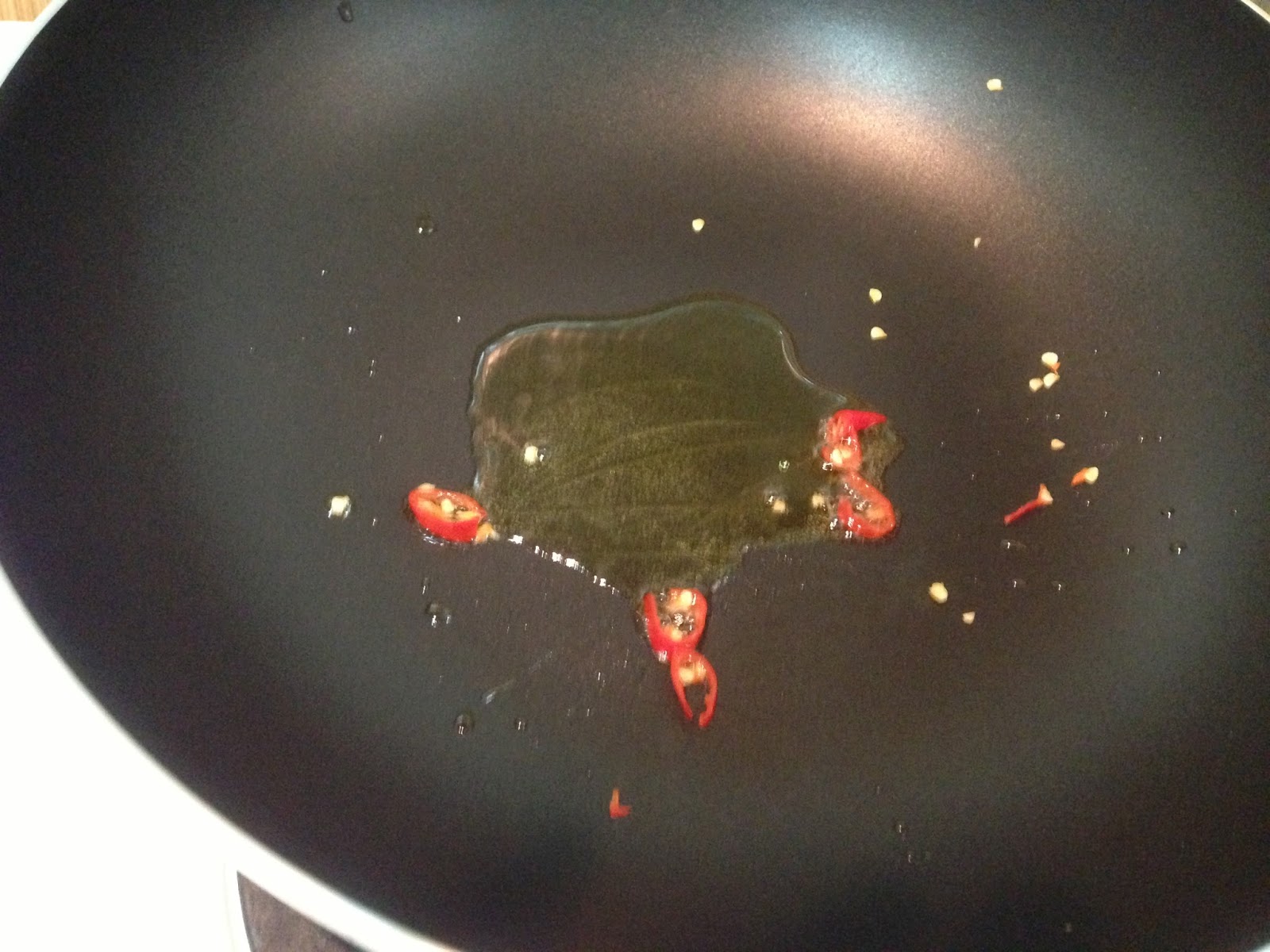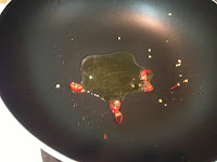 3. 一匙橄蘭油先將辣椒放入炒一下 加入 豆包 醬油2匙