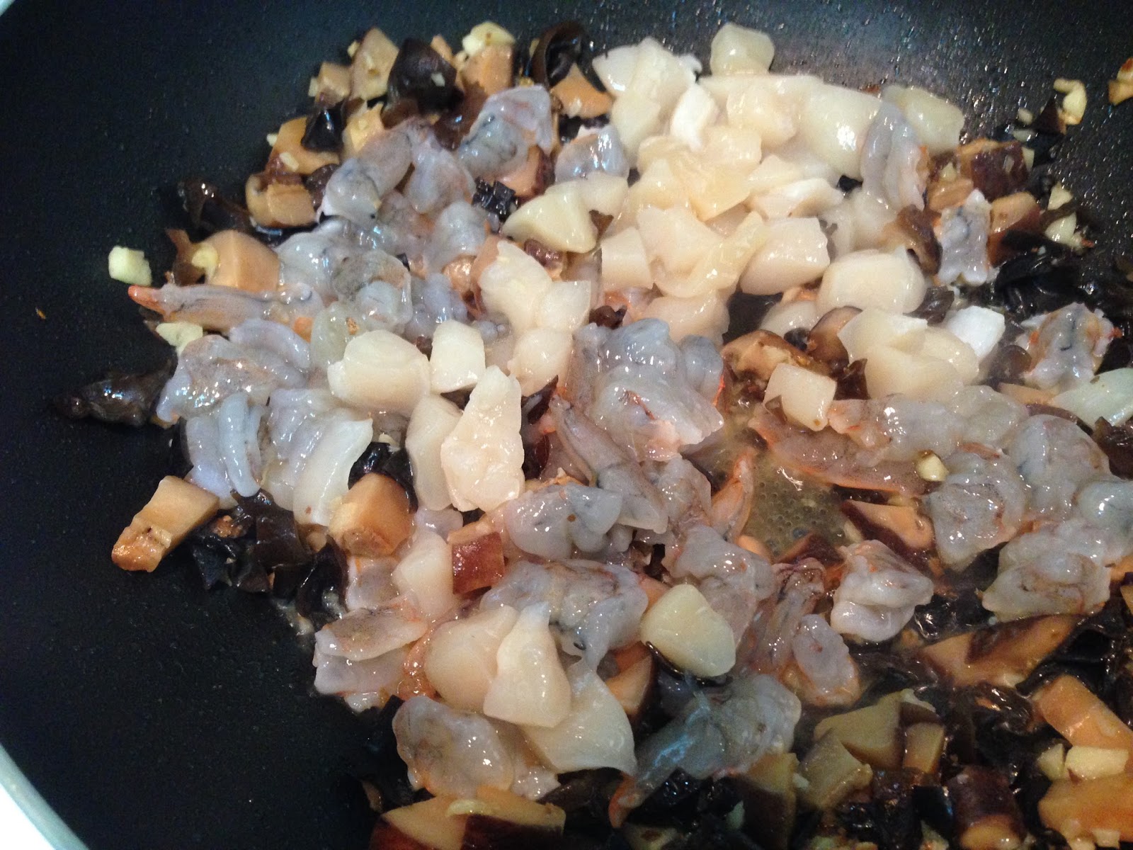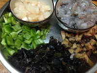 1 . 蝦仁 新鮮干貝 黑木耳 香菇 青椒全切丁 蔥花 薑末 蒜末