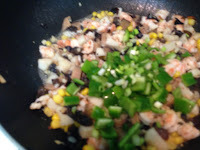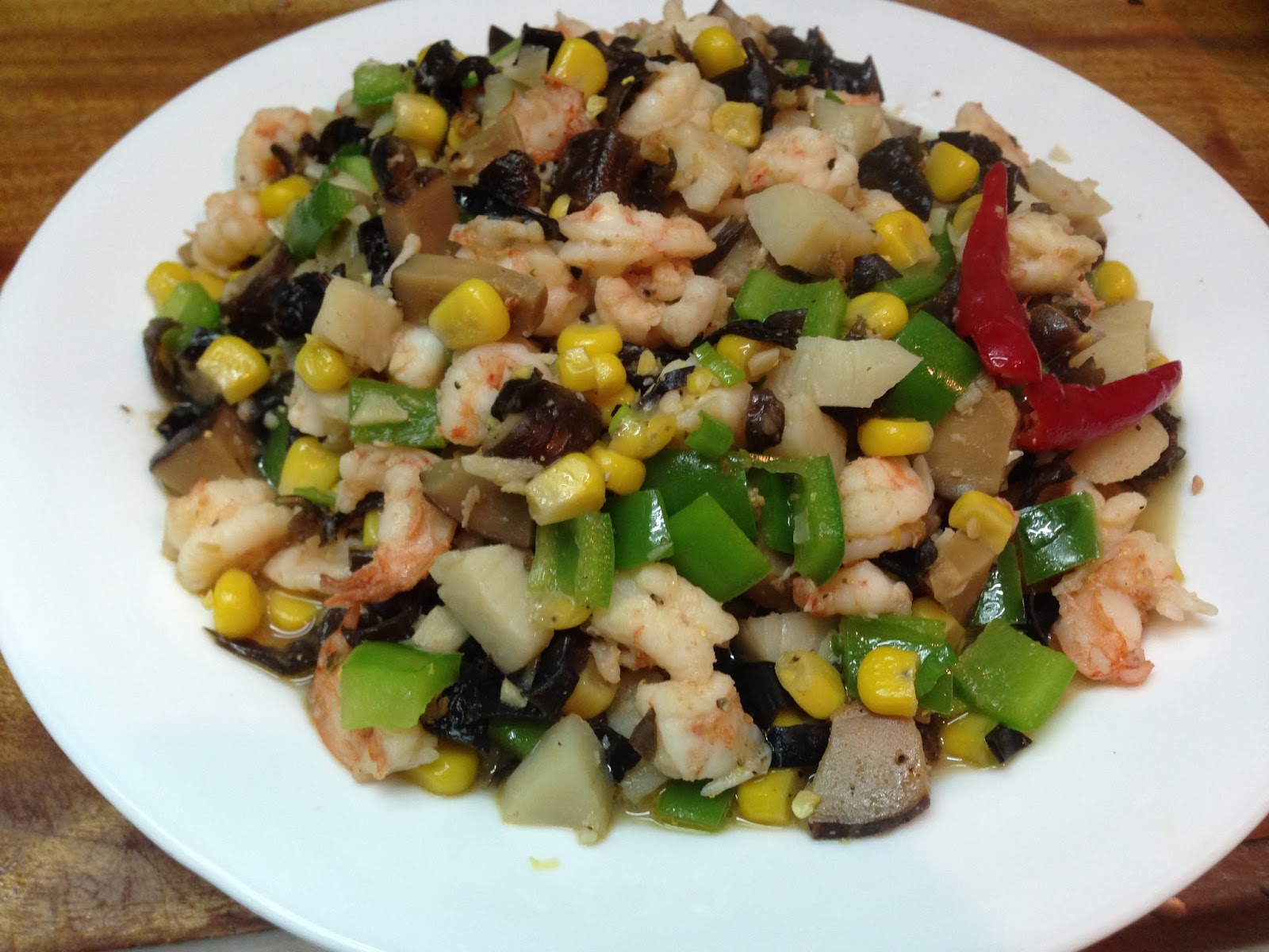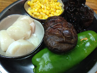 材料 : 蝦仁 新鮮干貝 黑木耳 香菇 青椒 玉米粒 蔥 薑 蒜頭