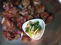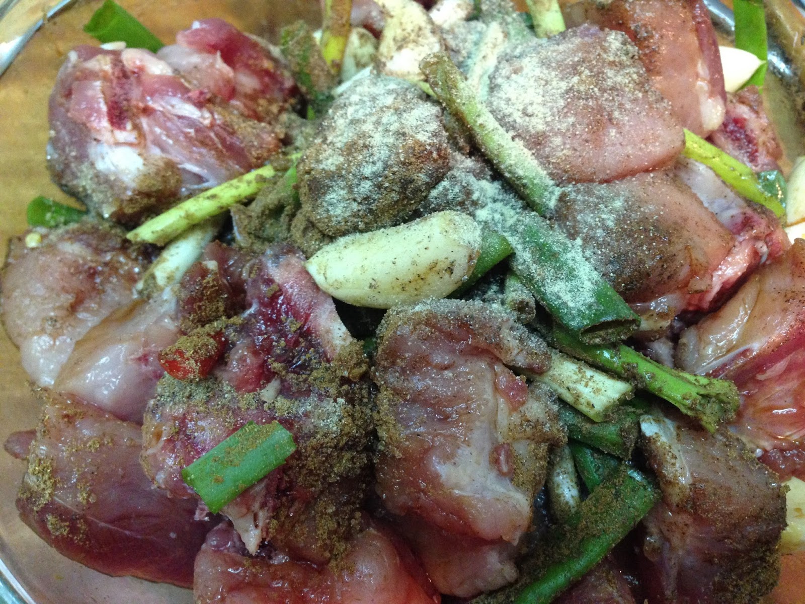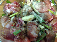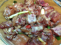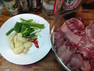 1 . 一匙米酒先拌入排骨攪拌一下 蔥段 蒜頭 辣椒放入