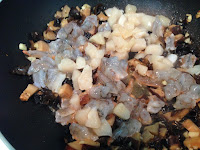 3 . 將蝦跟新鮮干貝放入炒熟加少許鹽一小匙米酒