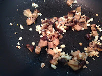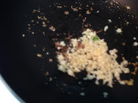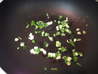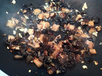 2 . 一匙橄蘭油先爆香薑末後加蒜末炒香放入香菇丁炒一下