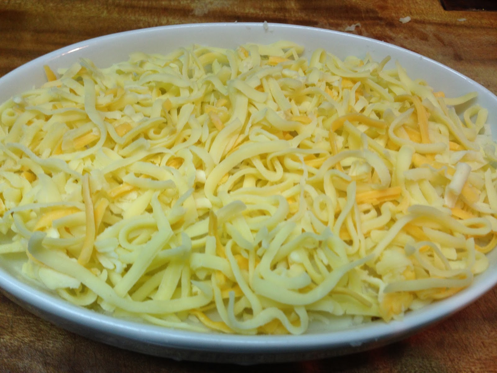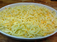 3 . 取一盤將拌好的馬鈴薯平鋪 再把起司絲灑在上面