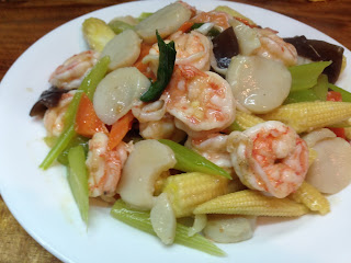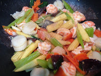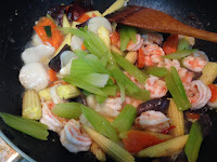 材料 : 蝦仁 生干貝 紅蘿菠 玉米筍 黑木耳 西芹(先汆燙)