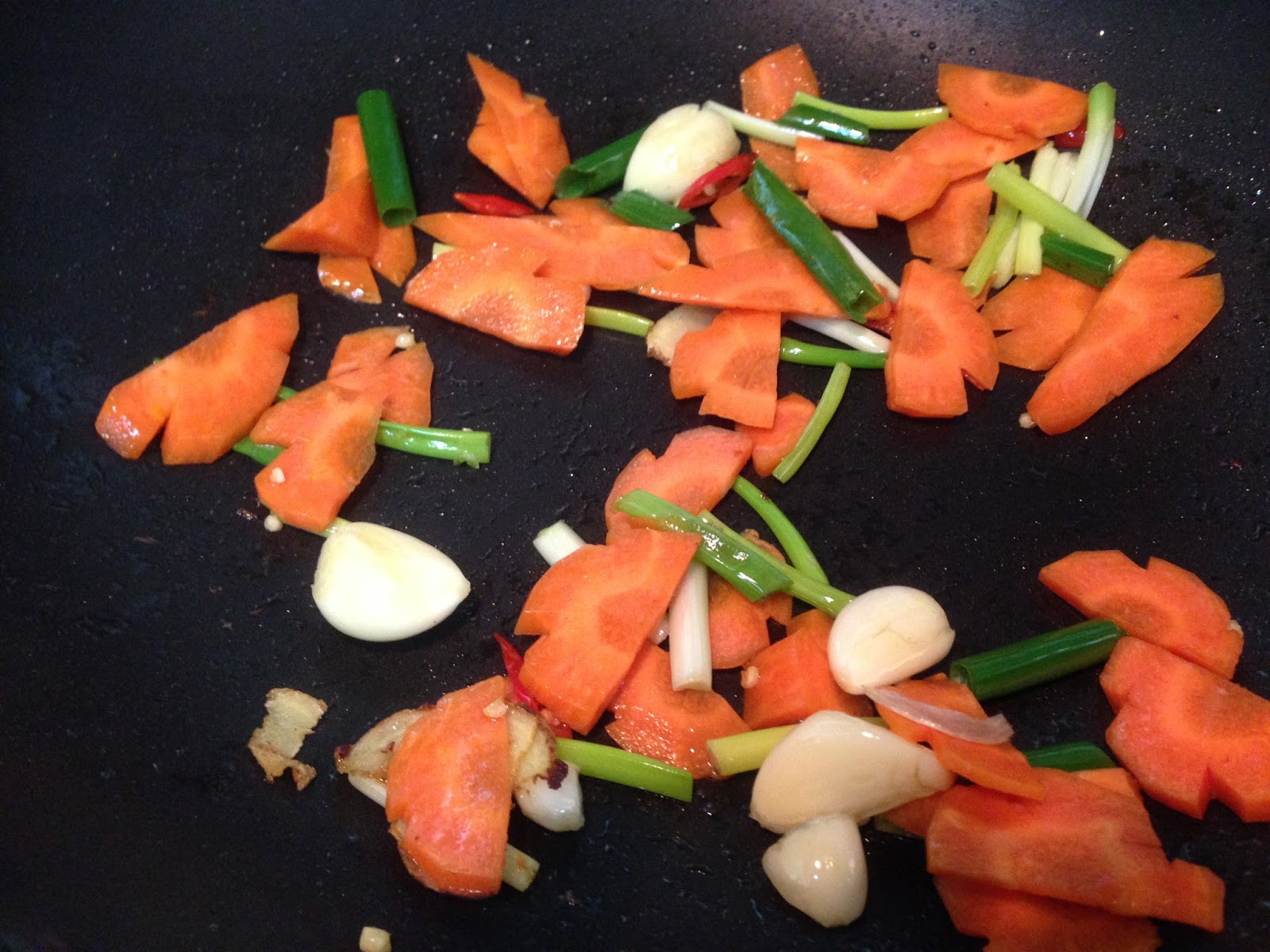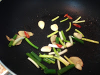 一匙橄蘭油爆香薑片後將蔥段 蒜頭 辣椒一起爆炒