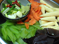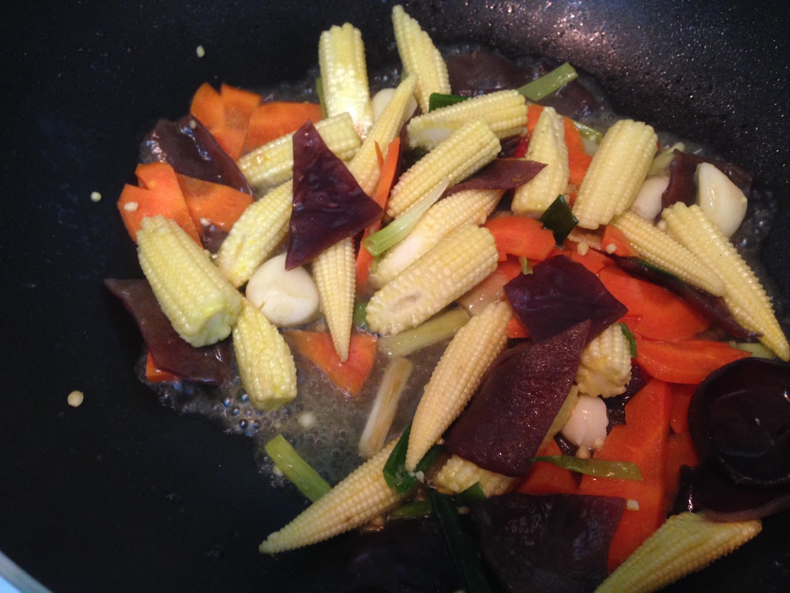 依序放入 紅蘿菠 玉米筍 黑木耳加些水煮一下