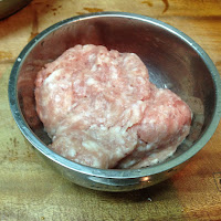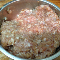 1 . 先將絞肉加一匙醬油 ㄧ小匙米酒 ㄧ小匙蓮藕粉