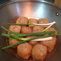 將鑲好的豆包放入鍋中加一匙蠔油ㄧ碗水