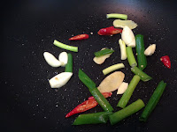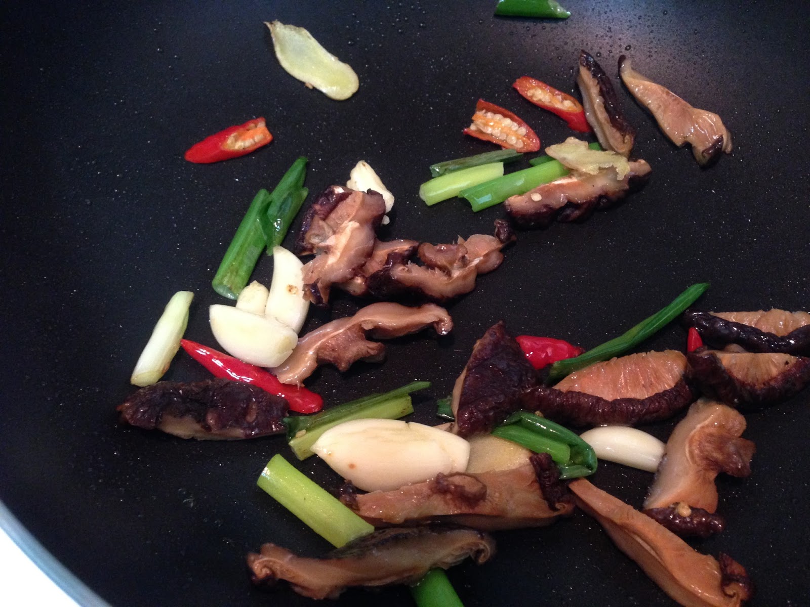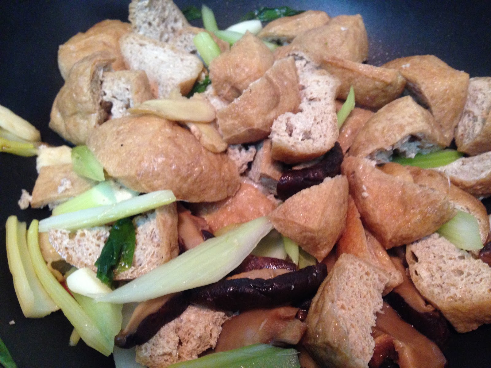1. 一匙橄蘭油爆香蔥 蒜頭 辣椒 香菇放入炒一下加入豆包