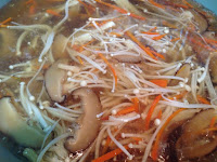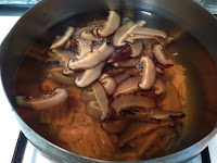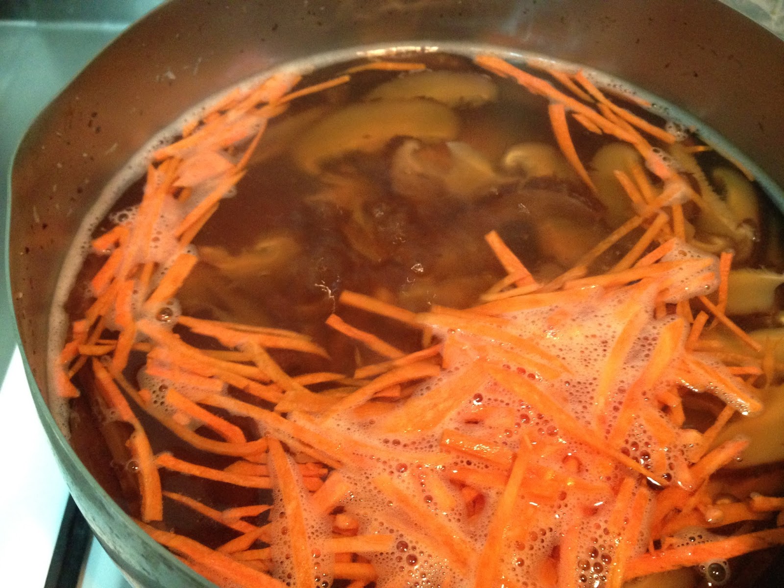 1. 先將干貝絲跟香菇絲煮出味 加入紅蘿菠絲煮一下