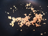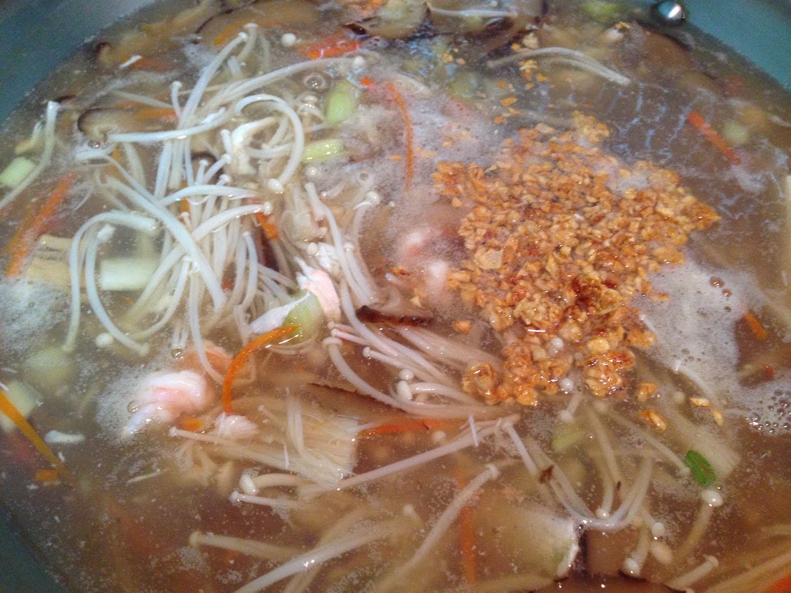 另起一油鍋一匙香油將蒜末炒成蒜酥 加進羹湯裡