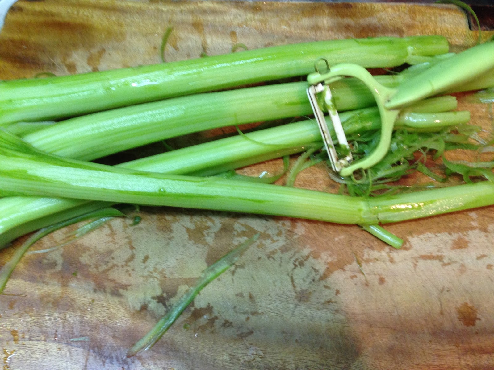2 . 一匙橄蘭油爆香蒜頭辣椒 汆燙過的西芹根切片的