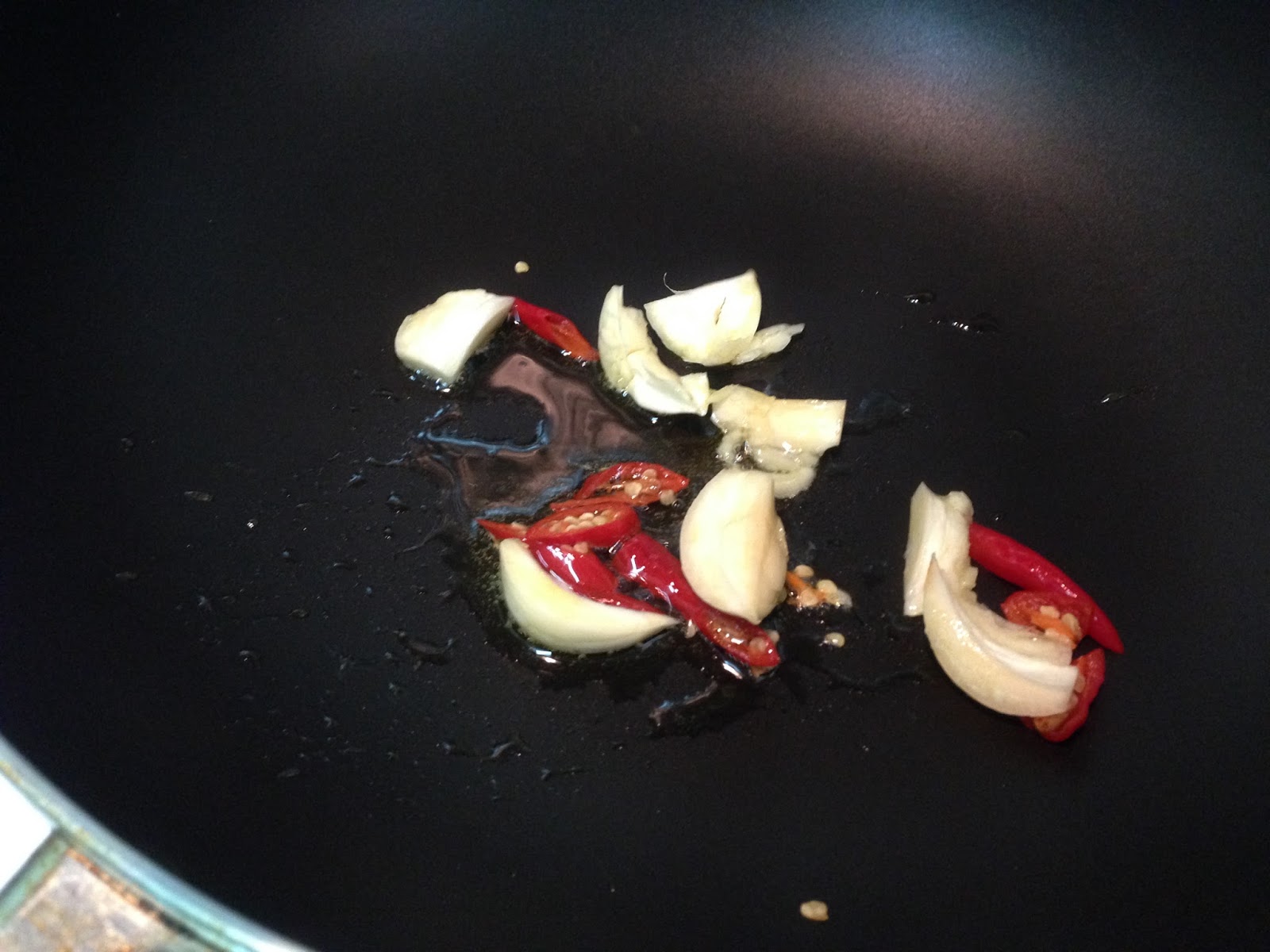 蒜頭拍一下 辣椒切絲 花枝丸切片