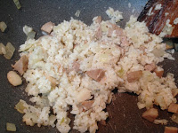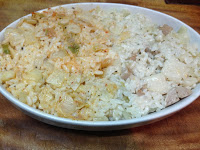 3. 拌勻的飯分兩碗 分別加入貢丸丁 花枝丸丁